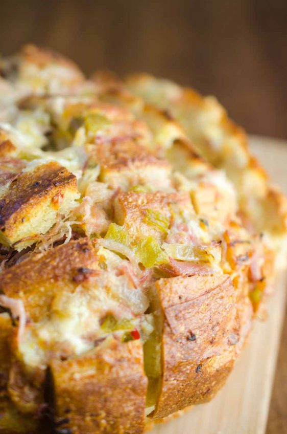 This pull apart bread is super easy to make. All you need to do is cook the onions, pork and chilies together, mix them with cream cheese, pepper jack and cheddar and stuff it in a sliced bread boule and then bake until the cheese is golden and bubbly.
