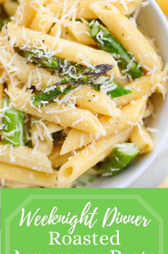 Roasted Asparagus Pasta is the perfect way to enjoy fresh spring asparagus! Tender asparagus tossed with penne in a creamy roasted garlic sauce.
