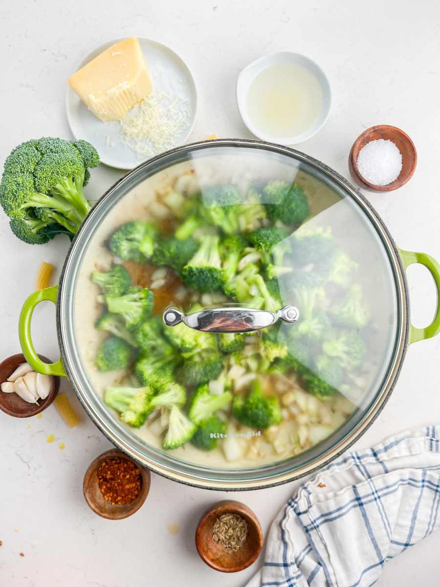 STEP #5: Add the broccoli florets to the pan, stir. Cover and cook for 5 – 6 minutes or until the broccoli is fork tender. The size that you cut the broccoli will greatly impact the cook time. If the florets are really small it may take less than 5 minutes.