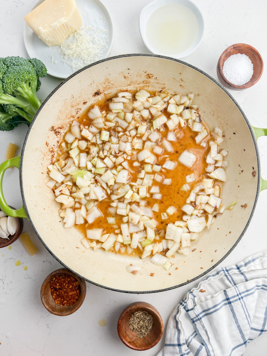 STEP #3: Heat olive oil in the same pan that you cooked the sausage. Add the onion, garlic, crushed red pepper and fennel seed. Continue to cook 1 – 2 minutes or until the onions are softened and the garlic is fragrant.
