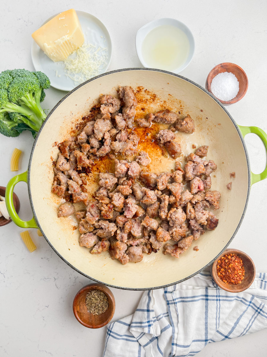 STEP #2: While the pasta is cooking, cook the sausage in a large skillet until browned and cooked through. Drain excess grease.