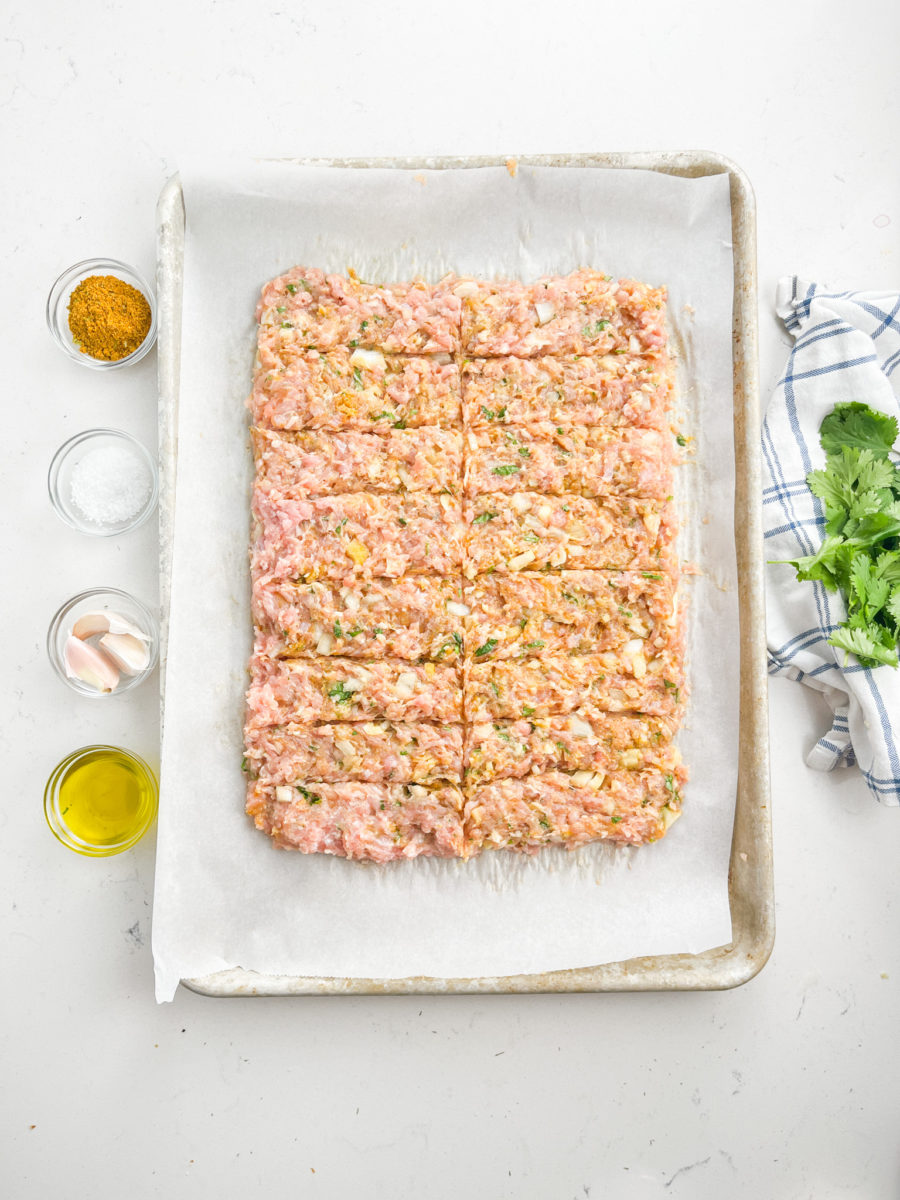 Press meat mixture into 1/2 inch thick rectangle on prepared baking sheet. Use a knife to score 8 – 10 horizontal lines then one down the middle lengthwise.