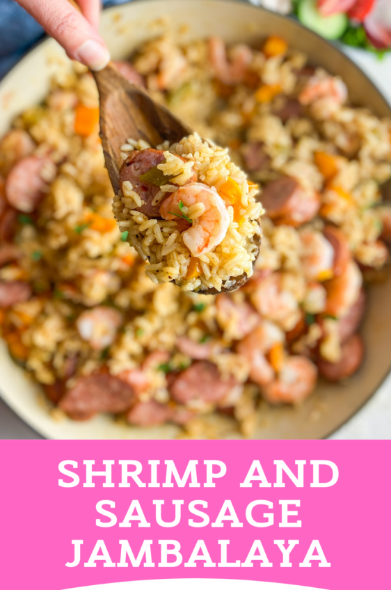 This Shrimp and Sausage Jambalaya Recipe is a super flavorful one-pot meal. Loaded with shrimp, andouille sausage, peppers and cajun seasoning.
