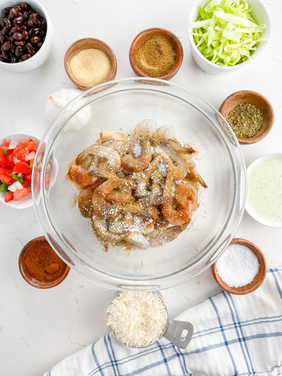 STEP #5: Assemble the bowls. Place rice and beans in a bowl. Top with cabbage, pico de gallo, and shrimp. Drizzle with cilantro cream sauce.