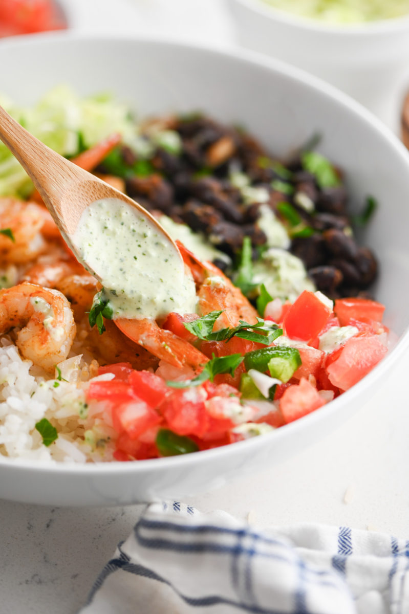 Assemble the bowls and drizzle with cilantro cream sauce.