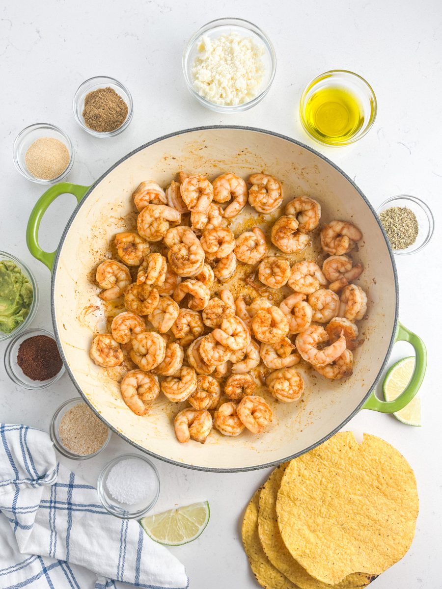 - SEASONINGS: To season the shrimp you’ll need a seasoning blend made with chili powder, cayenne pepper, granulated garlic, cumin, dried oregano, salt and onion powder. This mixture is a little spicy, a little smoky and packed with flavor.