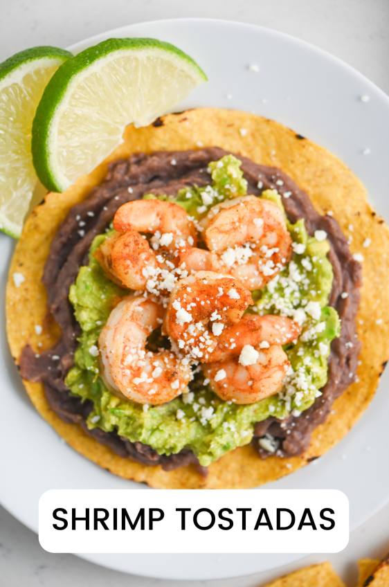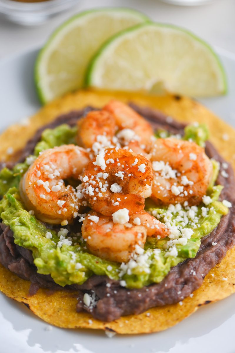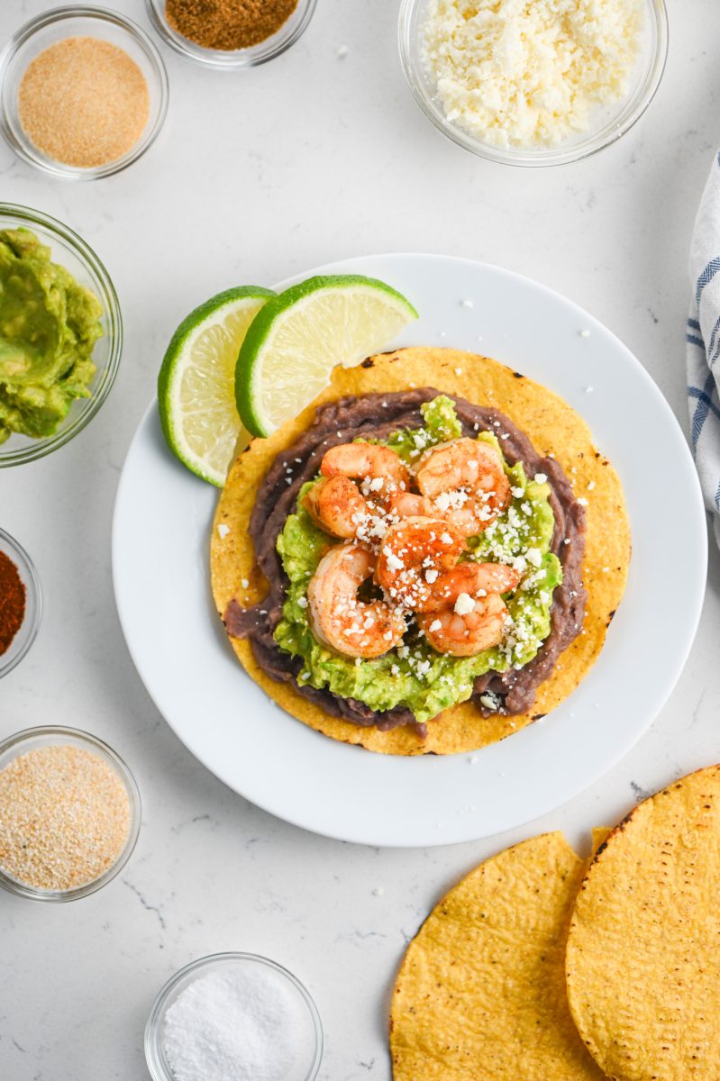 - STEP #4: Assemble the tostadas. Spread black beans on tostada shells, top with guacamole, shrimp and cotija cheese. Serve with lime wedges.