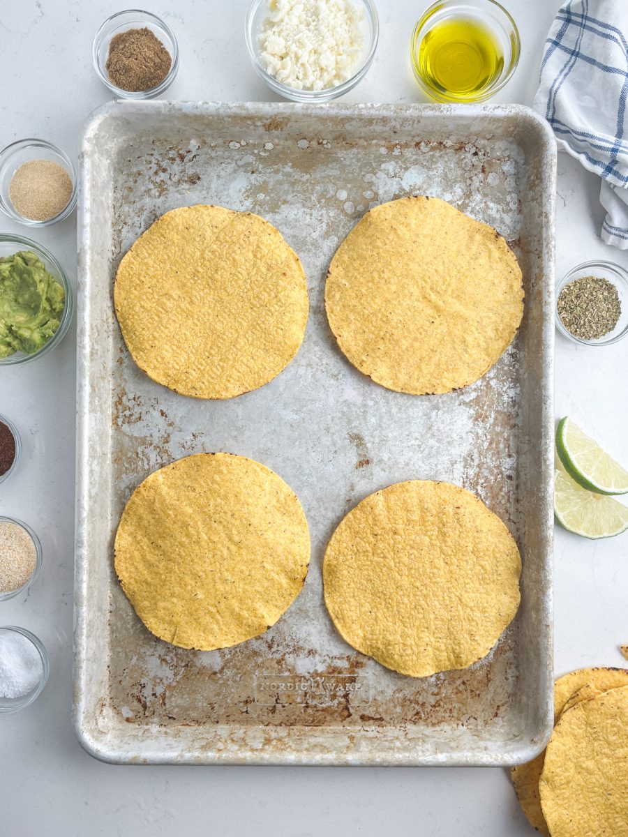 When ready to cook, preheat oven to 200 degrees to warm up the tostada shells. Cook 5 minutes or just until warmed. Optional but I like them warmed.