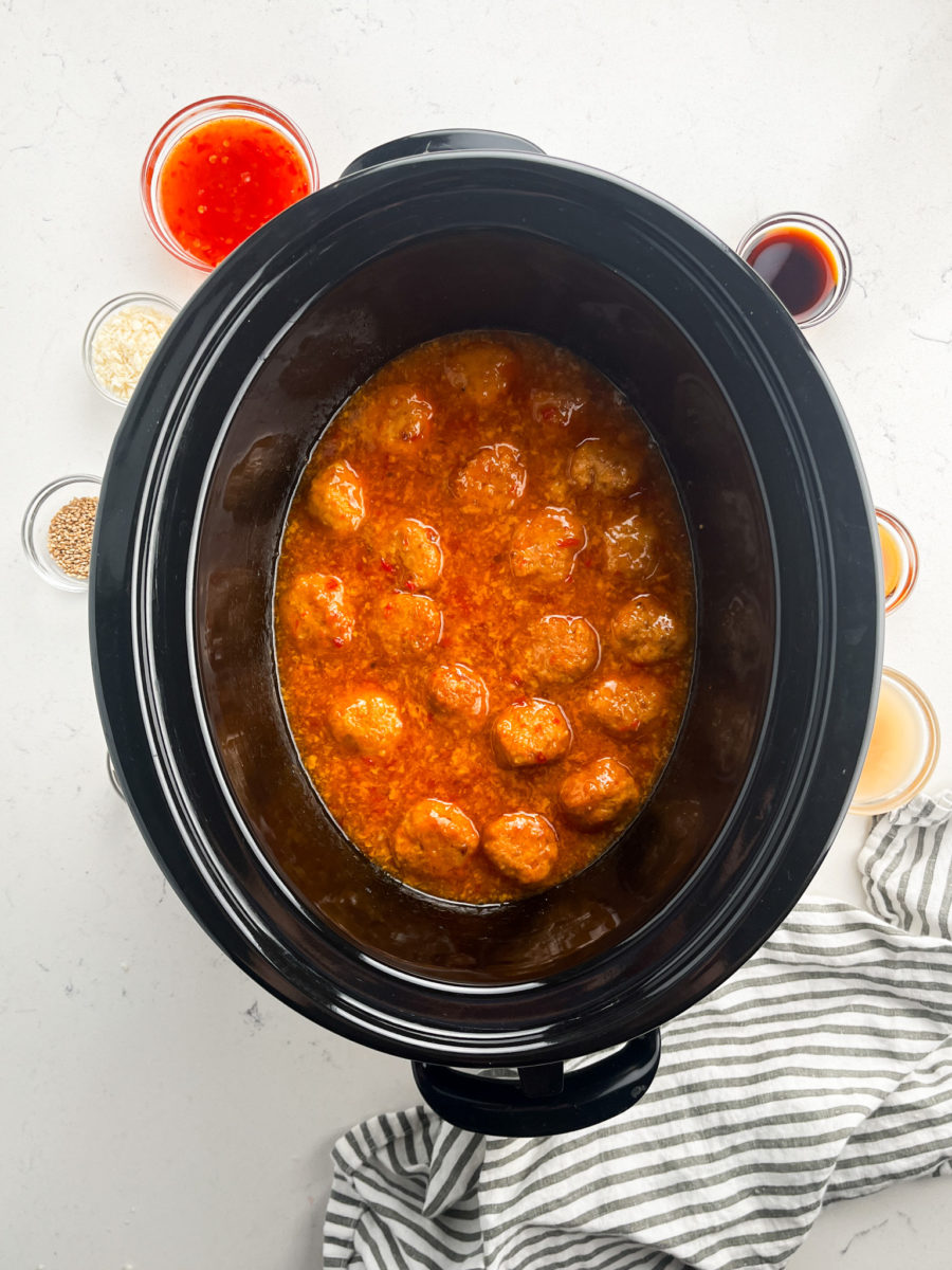 After 4 hours, stir the meatballs and pour in sweet chili sauce. Cover and cook on low for two more hours.