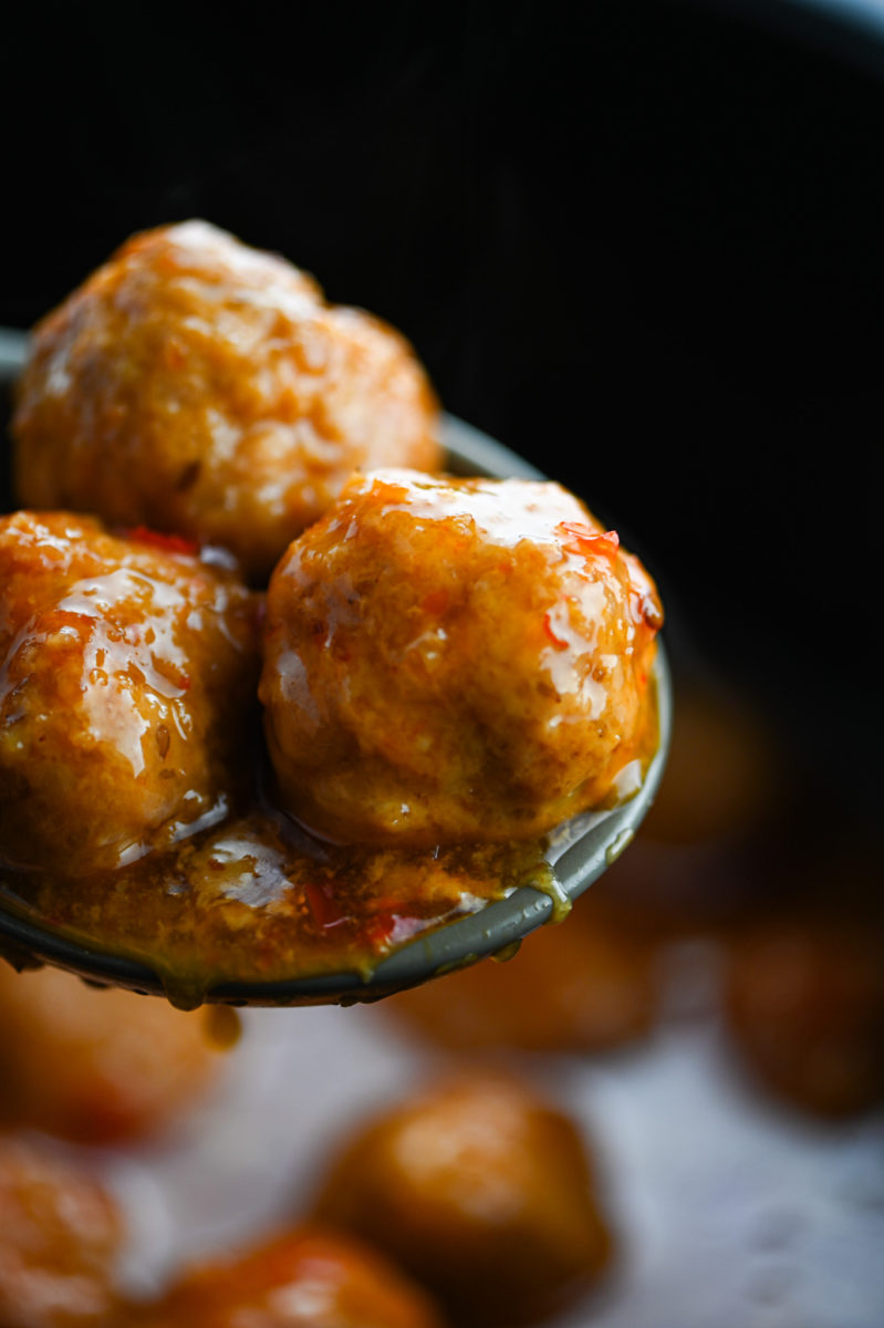 Sweet Chili Meatballs are a great weeknight dinner! Flavor packed pork meatballs with sesame, garlic and soy sauce are slow cooked in a sweet chili sauce.