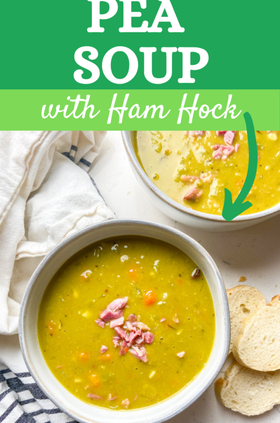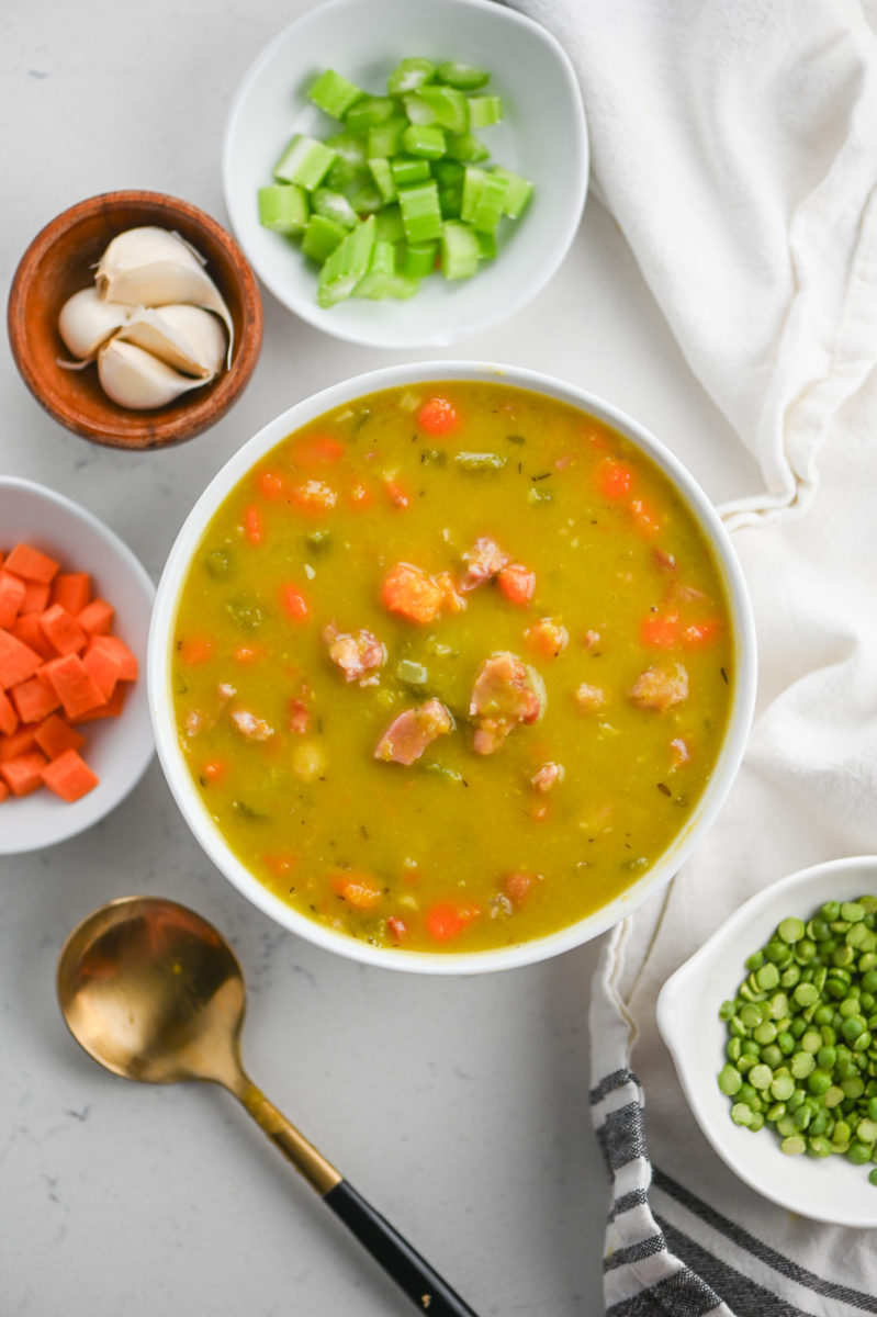 The split peas cook down giving the soup a velvety texture. The ham hock gets tender and adds a smoky flavor. And the addition of thyme and rosemary rounds out the flavor out to make a super comforting bowl of soup.