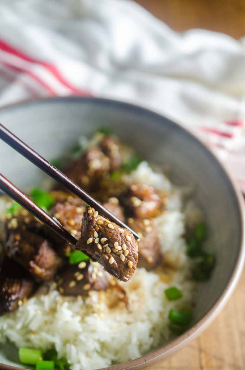 Just as predicted, Teriyaki Steak Bites were a hit with the kiddos. They gobbled them up and asked for seconds. They especially loved them served alongside garlic rice and salt and pepper roasted Brussels sprouts.