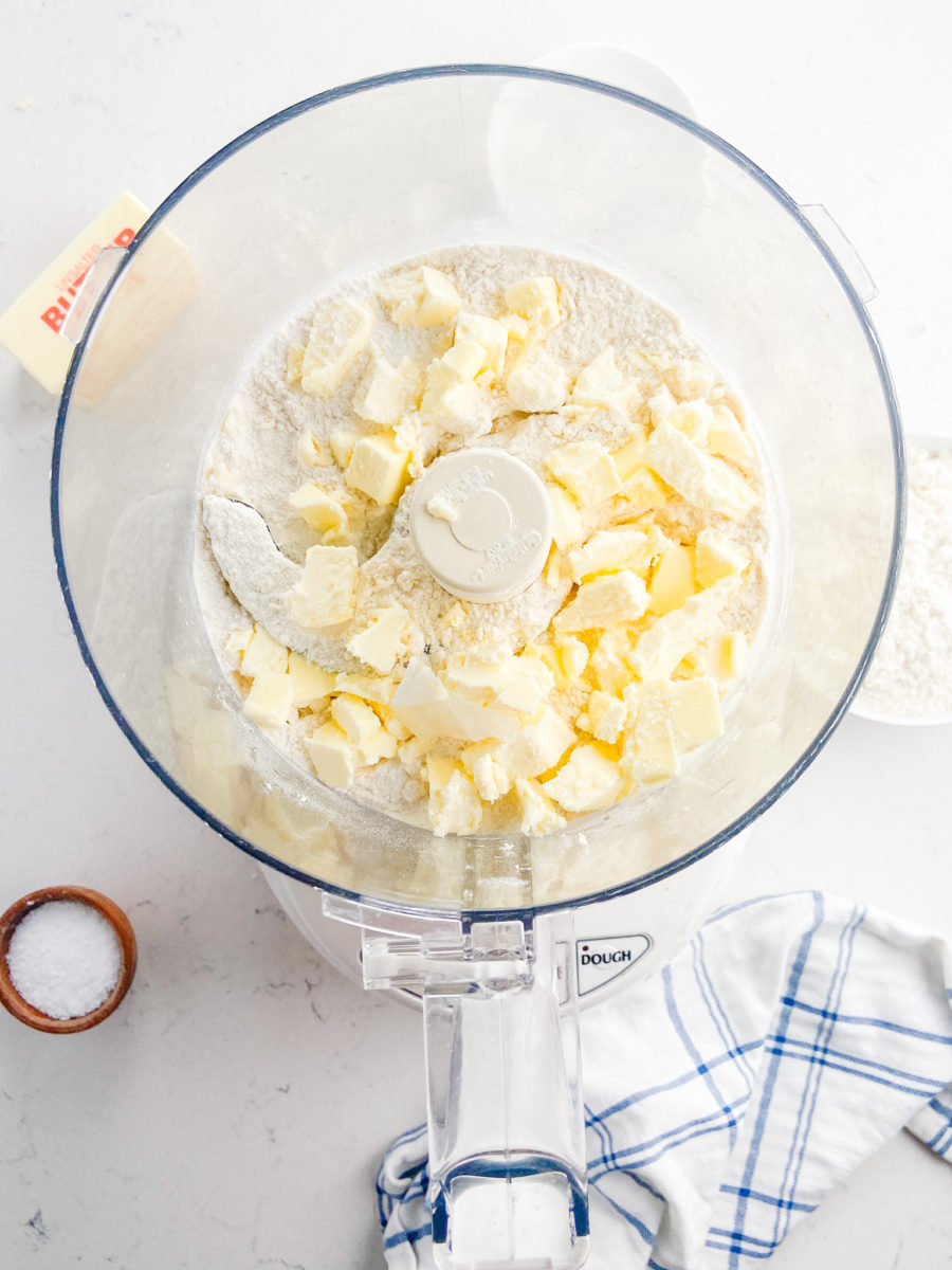 STEP #1: Make the tart crust by pulsing flour, butter, salt and water together in a processor until crumbly but can hold its shape if pressed together. Wrap dough (it will be crumbly) in plastic wrap and shape into a disc. Chill for 20 minutes.