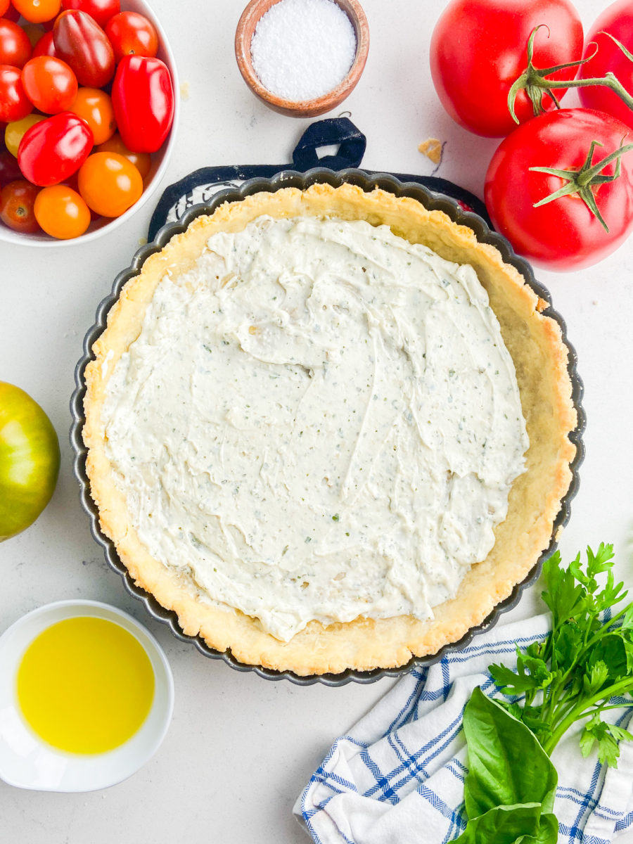 STEP #2: After dough has chilled press into a 9-inch tart pan. No need for rolling! Bake at 450 for 10 minutes. Prick with a fork, brush with egg wash and bake for another 2 – 3 minutes or until golden brown. This will help seal the crust so that the juice from the tomatoes won’t make it soggy. Allow to cool slightly.