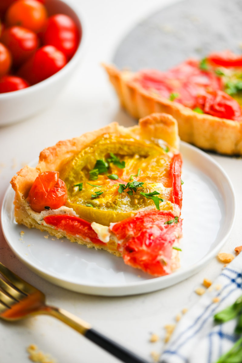 This savory Tomato Tart is perfect for lunch or a light dinner! This gorgeous tart has layers of buttery crust, spreadable cheese and fresh summer tomatoes. You’ll love it!