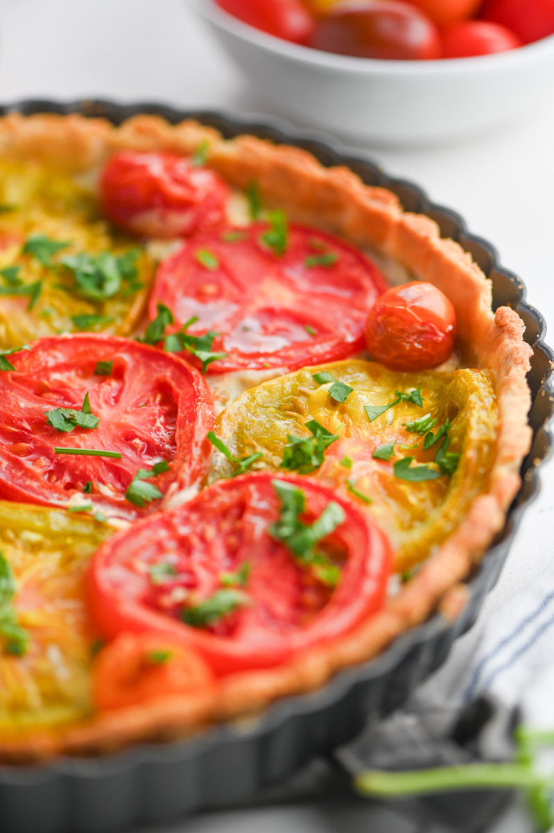 This tomato tart is really best eaten the day that it is made, however you can reheat individual slices in the microwave for 15 – 30 seconds.