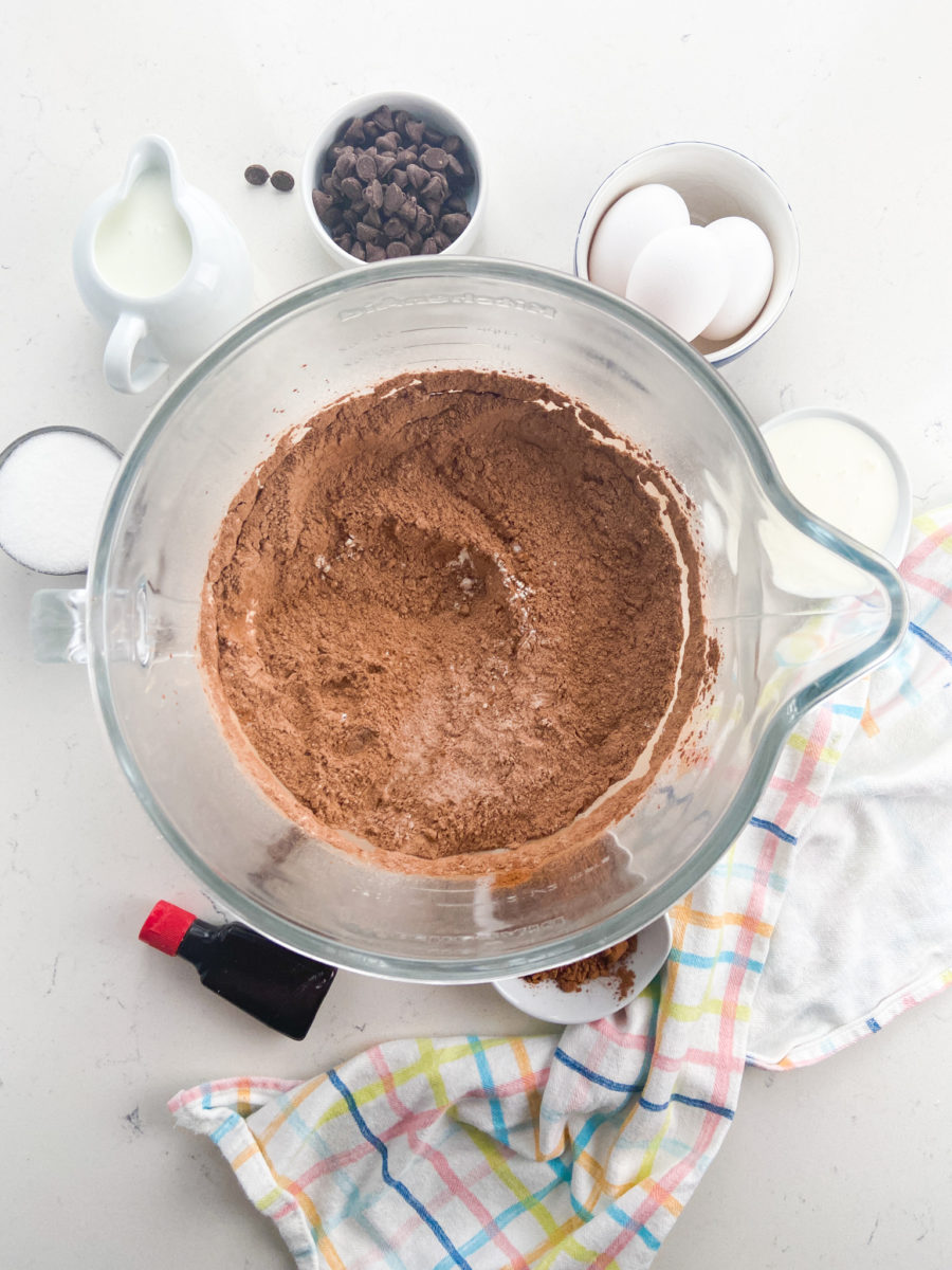 STEP #1: In a bowl of a stand mixer fixed with the paddle attachment (or using an electric hand mixer) combine sugar, flour, cocoa powder, baking powder, espresso powder, baking soda and salt. Mix together.