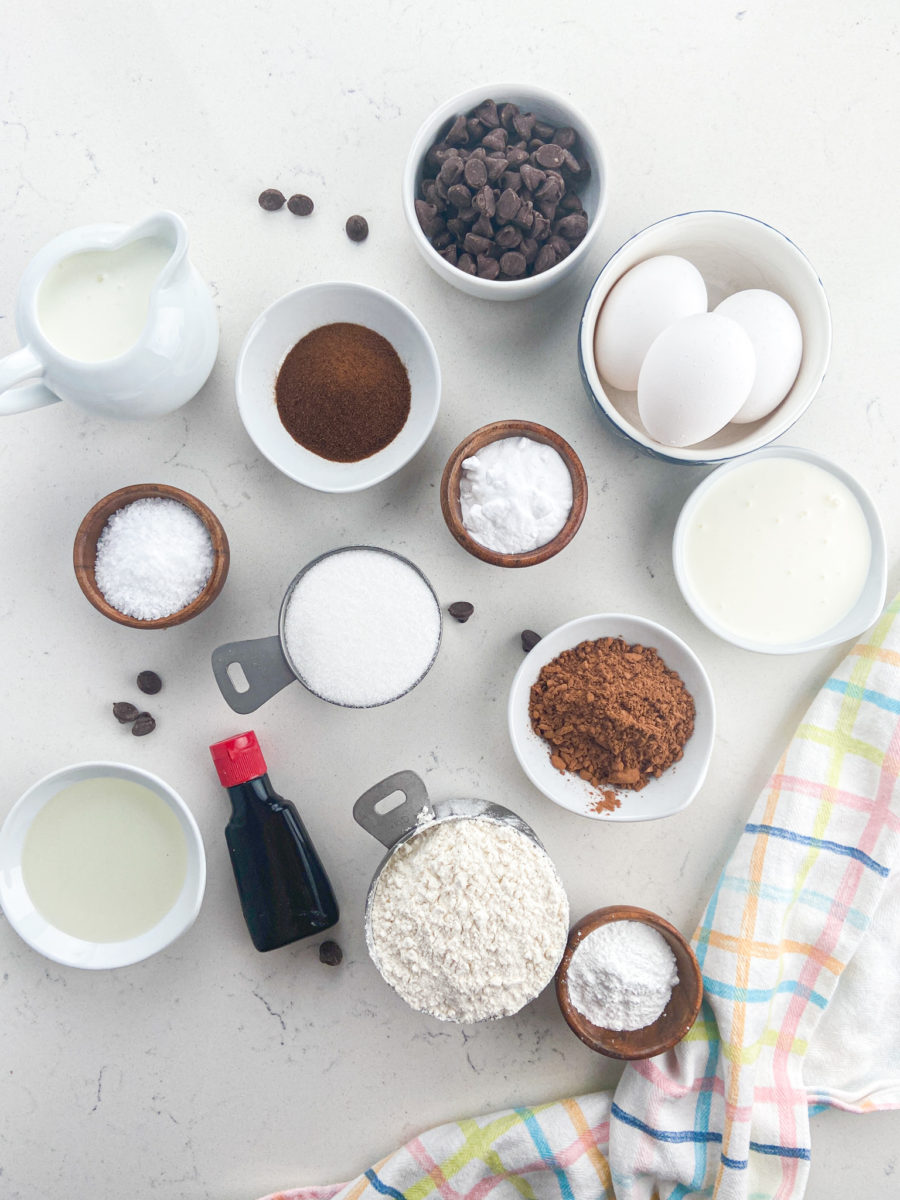 You’ll find the traditional chocolate cake ingredients in this recipe like: sugar, flour, baking powder, eggs and vanilla. This recipe does call for a couple other ingredients that you might not think of.