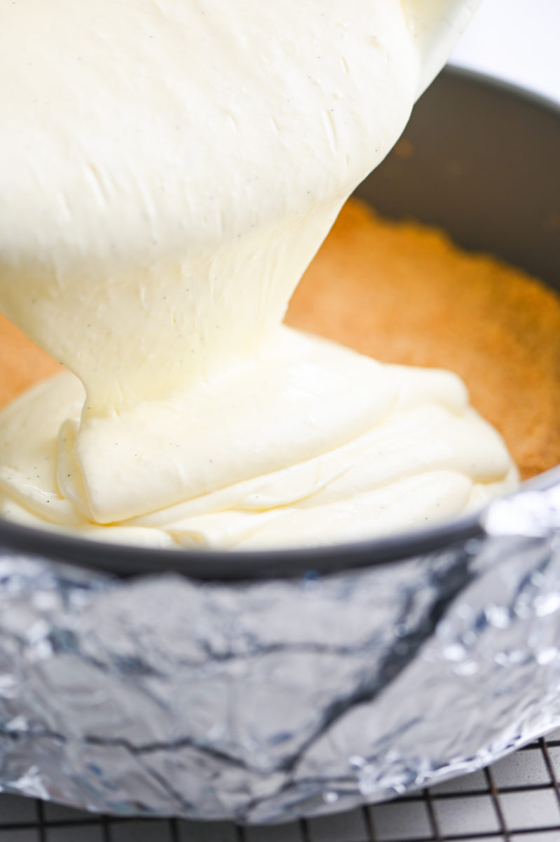 STEP #1: Preheat oven to 350 degrees F. Wrap the outside of a 9″ springform pan with two layers of heavy duty aluminum foil. This will help prevent water from the water bath from seeping into the cheesecake as it cooks.