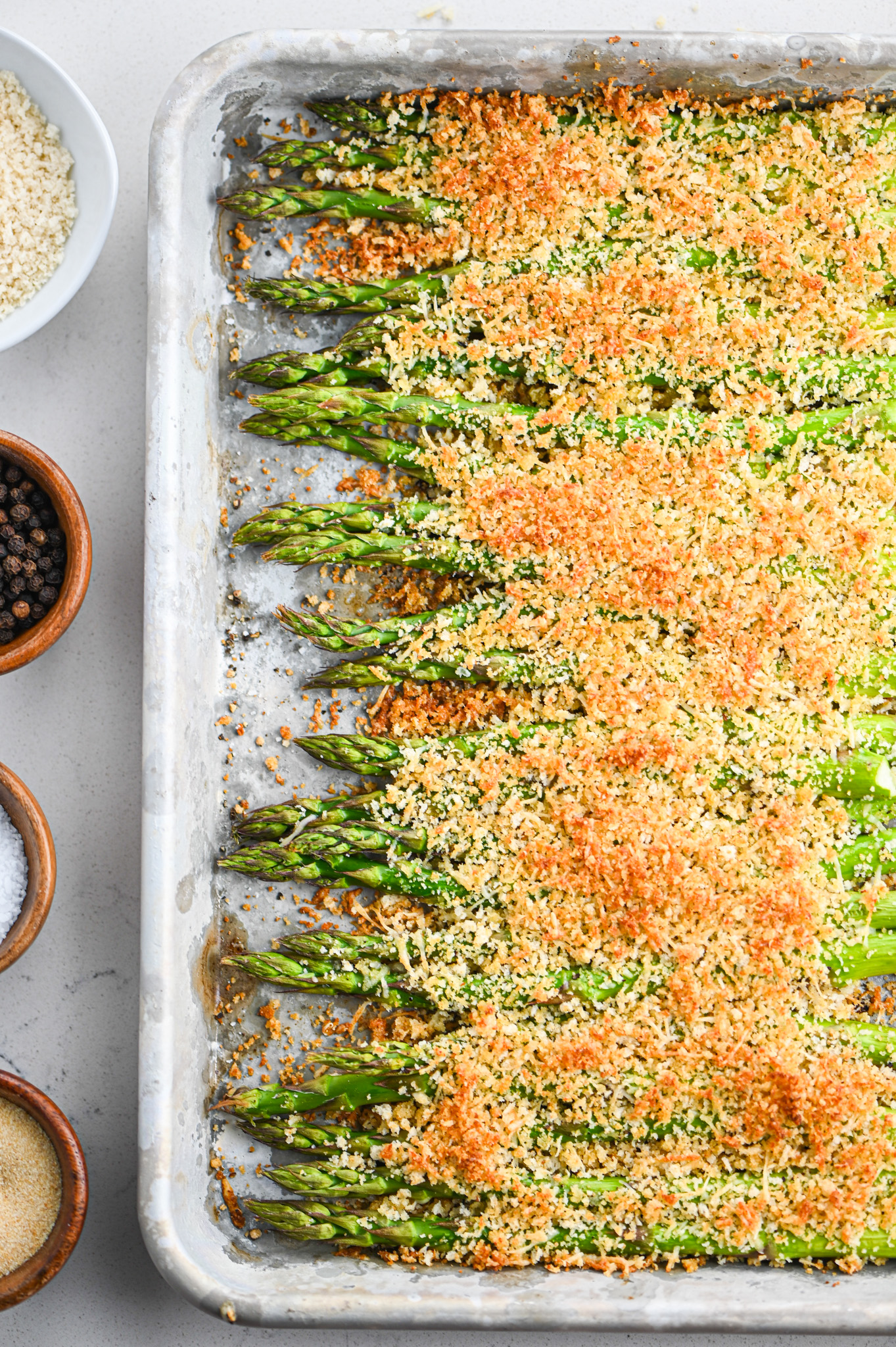ASPARAGUS PLAIN BREAD CRUMBS PANKO BREAD CRUMBS OLIVE OIL SALT PEPPER GRANULATED GARLIC PARMESAN