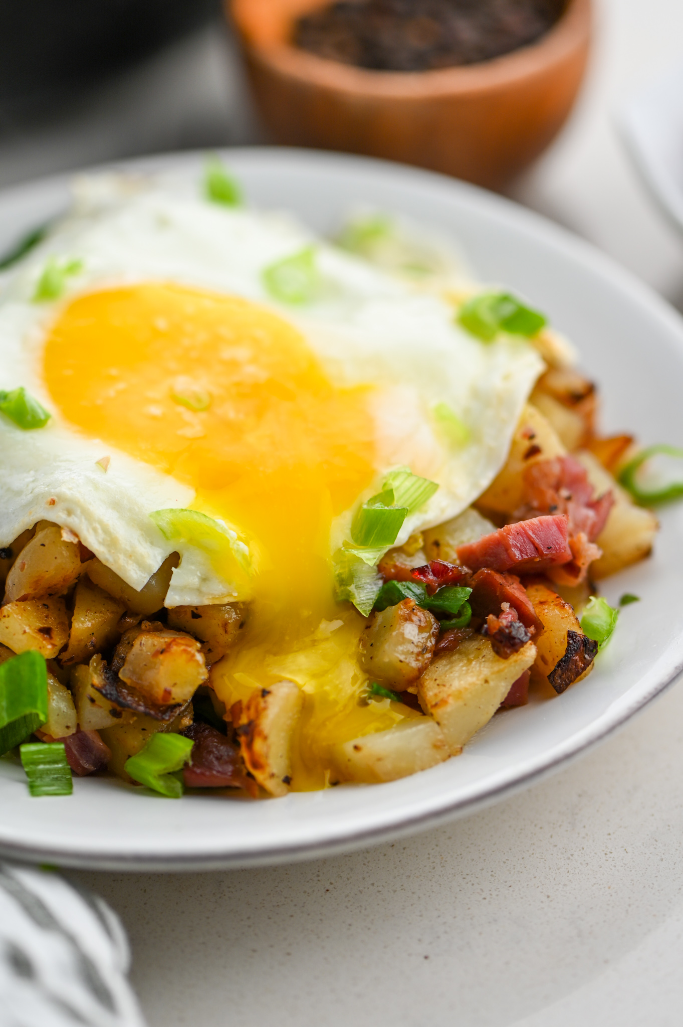 CORNED BEEF POTATOES ONION BUTTER SALT PEPPER OLIVE OIL GREEN ONION EGGS
