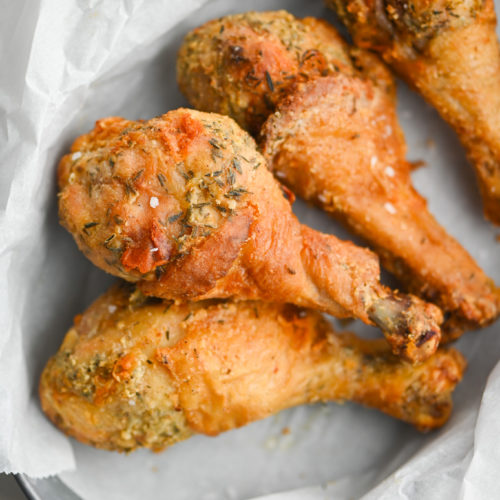 I usually need to cook this chicken in two batches as I can fit 5 chicken drumsticks per batch in my air fryer. Depending on the size of your air fryer it may take you more or less. At the halfway point when you turn the chicken, make sure that you spray the chicken with more non-stick spray to ensure that there are no dry spots. This will help keep the chicken browned and crispy instead of dry and flour-y. Nutrition facts for estimation purposes only.