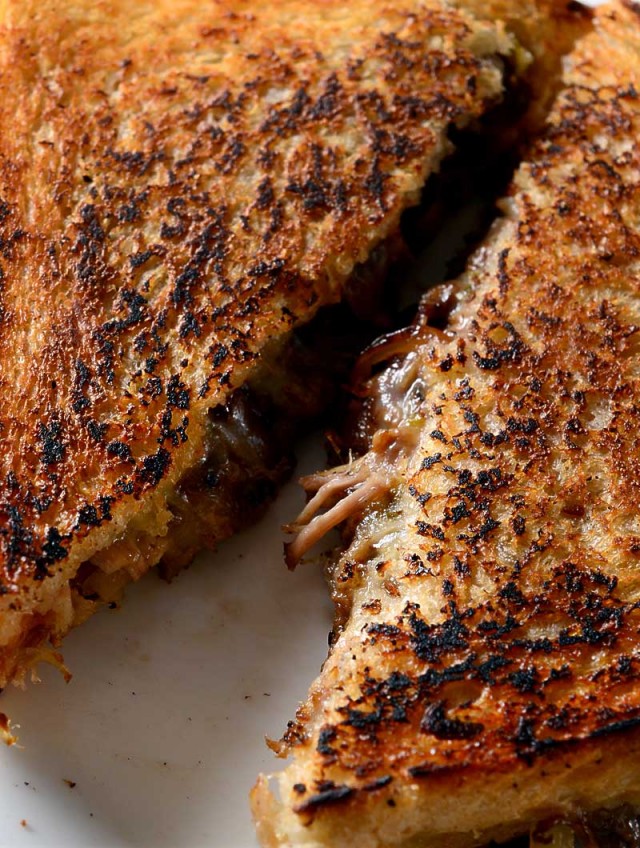 To assemble the sandwiches. Butter one side of each slice of bread. On the side that is not buttered place two slices of pepper jack cheese. Top with pulled pork and caramelized onions and one more slice of cheese. Top with another slice of bread, butter side out.