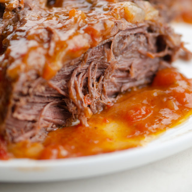 This can be cooked in the slow cooker but you'll need to sear the beef in another pan and then transfer it to a slow cooker. Cook on low for 6-8 hours with onions, tomatoes and beef. Then remove and carefully transfer the sauce to a pan to reduce to make the tomato gravy. Don't skip the searing. It adds flavor to the final dish. Nutrition information for estimation purposes only.