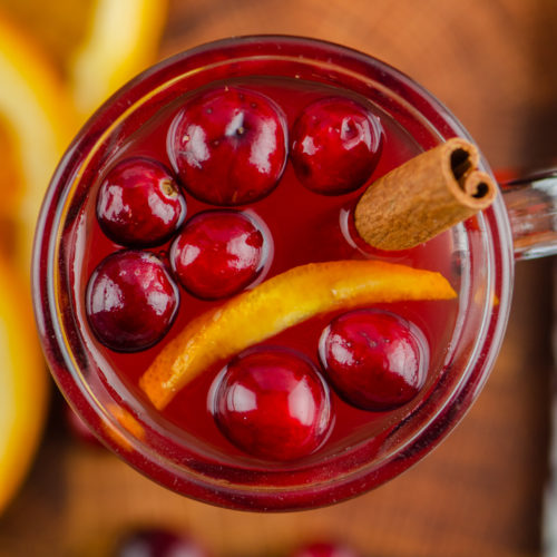 Ladle hot cider into mugs. Garnish with a cinnamon stick, a few fresh cranberries and an orange.