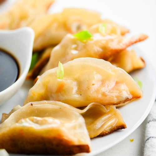Vegetable Potstickers are filled with a savory blend of cabbage, carrots, water chestnut. Serve with a spicy soy dipping sauce.