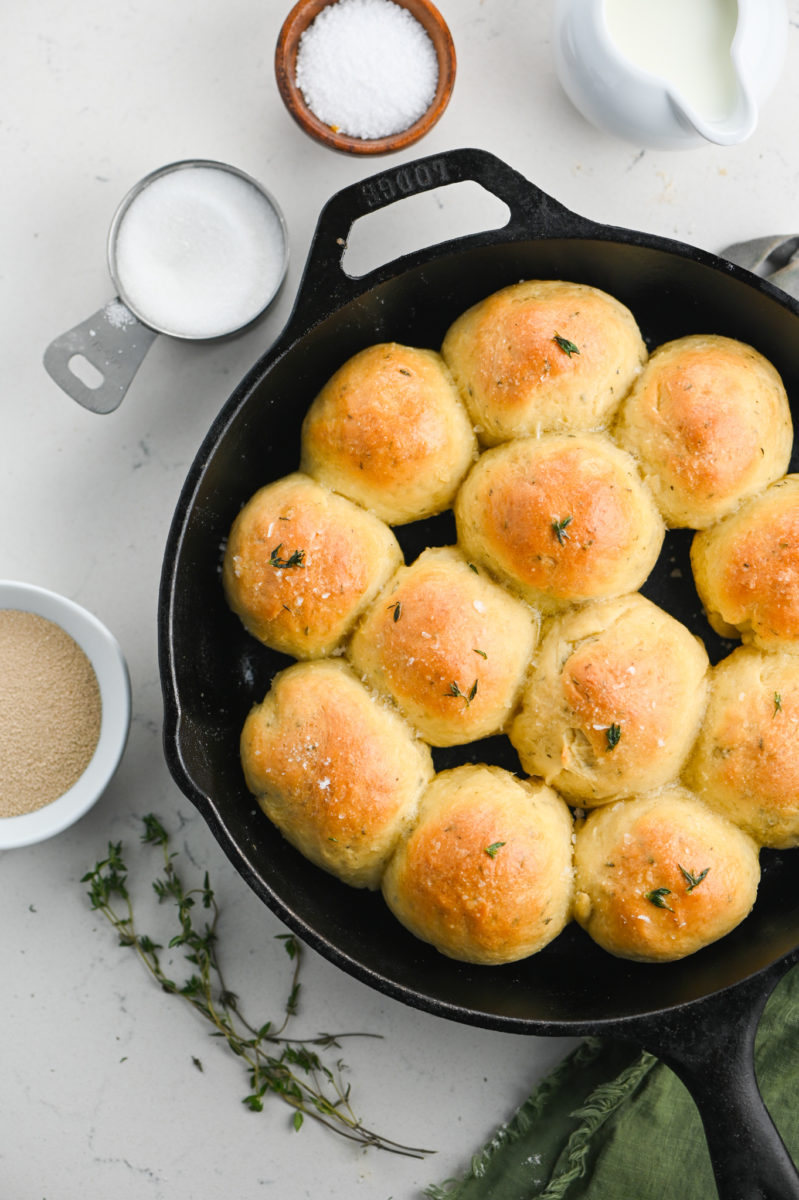 • THYME: This is totally optional but I wanted to add a touch of herb flavor to the rolls. I use dried thyme in the dough and fresh thyme in melted butter brushed over the top of the rolls after baking.